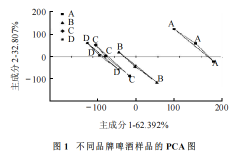 圖1為不同品牌啤酒樣品的主成分分析圖, 第一主成分和第二主成分的總貢獻(xiàn)率達(dá)到了95 .2% ,足以收集特征性信息。不同品牌的啤酒分別聚類在 PCA 圖中的不同區(qū)域,相互之間能夠較好地區(qū)分。