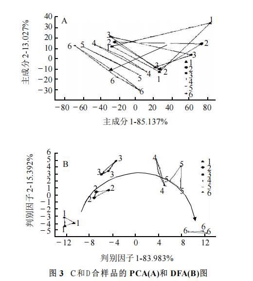 在圖3A 中,1 、2 、3 號樣品相互重疊而不能分開,其他 3 個樣品能夠很好地區(qū)分。沿著圖3A中箭頭所示的方向, 混合比例呈現(xiàn)一定規(guī)律的分布。在圖3B中,6 個不同混合比例的啤酒樣品相互之間能夠完全分開, 并且不同混合比例的啤酒樣品在 DFA 圖中的分布規(guī)律性更好。沿著圖中箭頭所示的方向,混合比例依次增加。從上述分析可以看出, 電子舌可以用于區(qū)分不同品牌啤酒的混合樣品。