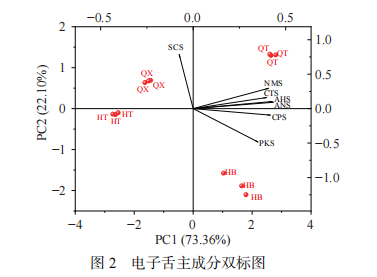 圖2顯示主成分PC1貢獻率為73.36%、PC2貢獻率為22.10%,表明主成分降維后數據能反映原數據的整體信息,四個樣品分布在四個象限中,無重疊,表明樣品之間存在較明顯差異性。主成分雙標圖貢獻影響因子在圖中以線段表示,越靠近樣品所在坐標軸,說明影響因子對其影響越大。樣品HT最靠近X軸,且樣品HT與QX相近,滋味相似;樣品HB距離其他樣品較遠,位于第四象限,其滋味差異主要體現在PC1上;結果表明,電子舌能明顯區分四個部位樣品,且樣品之間滋味差異明顯。