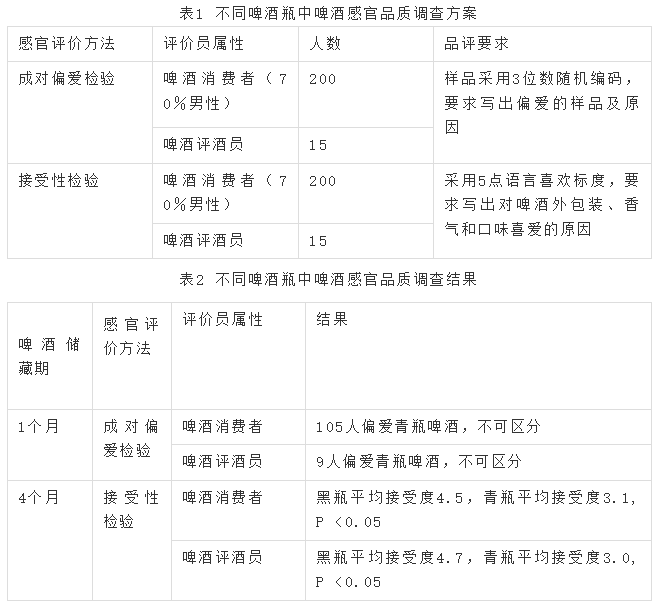 試驗(yàn)設(shè)計(jì):以10°純啤酒為樣品,分別采用相同容量的黑瓶與青瓶包裝,常溫條件下貯藏1個(gè)月和4個(gè)月后分別進(jìn)行感官調(diào)查研究。檢驗(yàn)方法選用成對檢驗(yàn)法、消費(fèi)者接受性檢驗(yàn)法,風(fēng)險(xiǎn)水平α=0.05。