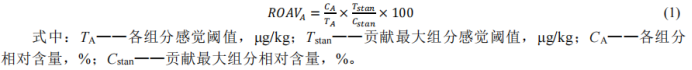 抓飯,市售;Asrree Ⅱ/LS16電子舌、HERACLES Ⅱ電子鼻,氣質聯用儀。 樣品粉碎,稱取1g樣品于20g樣品瓶中,迅速用專用瓶蓋壓蓋密封,電子鼻測定參數:清洗時間120s,樣品準備時間10s,測定時間120s,載氣流速150mL/min,每組樣品測定5次,取最后3次穩定數據進行分析。 稱取7.5g樣品定容至120mL,振蕩混勻,常溫振蕩孵育30min,4000r/min離心15min,上清液過濾后上機測定。數據采集前,對電子舌進行傳感器活化、校準等操作,確保檢測數據的可靠性與穩定性。將100mL濾液置于電子舌專用容器中,樣品采集與清洗交替進行每兩個樣品間放1杯100mL的蒸餾水,清洗10s,樣品采集時間120s,重復7次,取后4次試驗數據。 采用頂空固相微萃取法進行樣品處理,稱取2g樣品,放入20mL帶有硅膠墊帽的頂空萃取瓶中,立即密封,萃取溫度60℃,平衡15min,頂空吸附45min。250℃解析5min。 利用ROAV定義對樣品風味貢獻最大的揮發性風味物質,即ROAVmax=100,其它揮發性成分ROAV按式(1)計算。