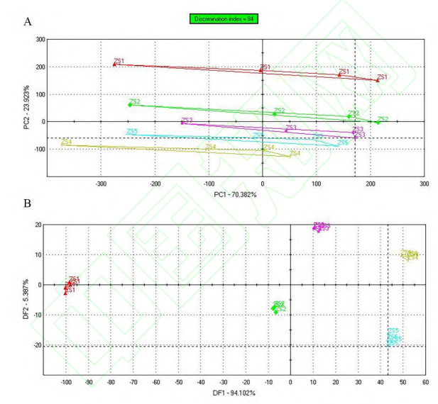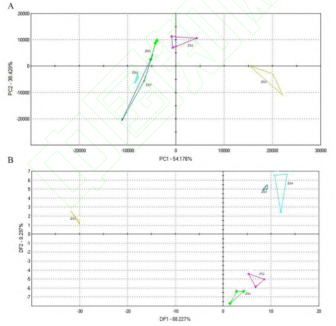 5種抓飯電子鼻檢測主成分分析PCA結果如圖1所示,第1主成分區分貢獻率為54.178%,第2主成分區分貢獻率為38.429%,2個主成分累計貢獻率92.607%,總貢獻率超過85%表明試驗方法的可行性,說明PC1和PC2兩軸包含了PCA轉換中絕大部分的貢獻率,主要成分可以較好地反映原來多指標的信息。ZS4和ZS5判別指數為7.4%,表明這兩個抓飯的香氣高度相似。判別因子分析DFA分析可知,不同抓飯在DFA圖中分別有各自的區域并且沒有重疊。其中主成分1(DF1)的貢獻率達到了88.227%,主成分2(DF2)的貢獻率達到了9.237%,主成分1(DF1)和主成分2(DF2)的累積方差貢獻率為97.464%,包含了樣品絕大部分信息,說明用DFA來表示電子鼻整體信息非??尚拧k娮颖墙Y合DFA可以很好地區分5種市售抓飯。