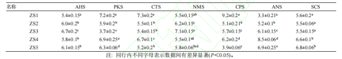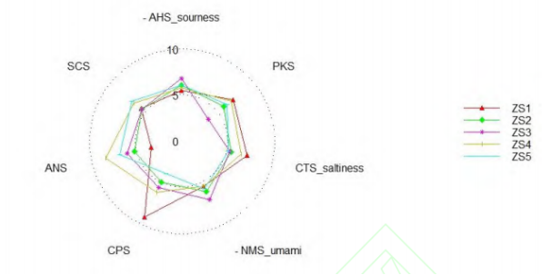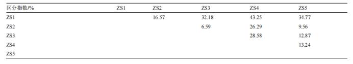 表1是5個不同品種抓飯電子舌區別指數分析,ZS2、ZS3、ZS5區別指數分別為6.59,9.56,12.87,距離值最小,可知三者味覺的相似性較大。ZS1和ZS4的距離值最大43.25,可知兩者的相似性最小。