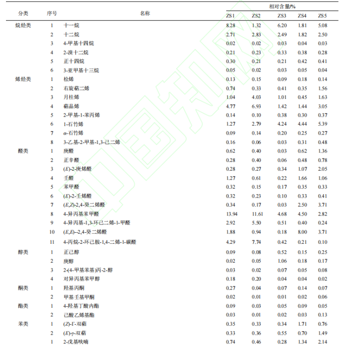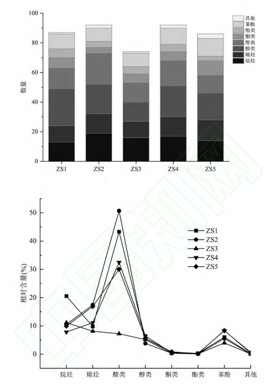 5種市售抓飯共鑒定出132種化合物,其中包括烷烴(25種)、烯烴(16種)、醛類(27種)、醇類(26種)、酮類(11種)、酯類(9種)、苯酚類(15種)、其它(3種)。從圖4可以看出,ZS1鑒定出87種,其中醛類(43.31%)、烷烴(20.54%)相對含量較高;ZS2鑒定出92種,其中醛類(50.68%)、烯烴(17.41%)、烷烴(10.53%)相對含量較高;ZS3鑒定出74種,其中烷烴(11.11%)、烯烴(8.11%)相對含量較高;ZS4鑒定出92種,其中醛類(32.47%)、烯烴(11.12%)相對含量較高;ZS5鑒定出86種,其中醛類(30.04%)烯烴(16.85%)相對含量較高。