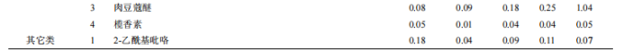5組抓飯GC-MS分析如表4所示,共檢測出共有揮發性風味物質39種,主要包括:烷烴類(6種)相對平均含量7.67%,烯烴類(8種)相對平均含量10.25%、醛類(11種)相對平均含量19.58%、醇類(4種)相對平均含量0.66%、酯類(2種)相對平均含量0.1%、酮類(2種)相對平均含量0.14%、雙萜類(2種)相對平均含量1.39%、其它(4種)相對平均含量1.46%。5組抓飯共有化合物相對平均含量為41.252%。相對平均含量超過1%的化合物有10種分別為:十一烷(4.54%)、十二烷(2.47%)、月桂烯(4.54%)、萜品烯(3.52%)、1-石竹烯(3.63%)、(E,Z)-2,4-癸二烯醛(1.35%)、4-異丙基苯甲醛(7.51%)、4-異丙基-1,3-環己二烯-1-甲醛(1.91%)、反式-2,4-癸二烯醛(2.94%)、4-丙烷-2-環己胺-1,4-二烯-1-碳醛(2.55%),這10種化合物相對總含量達到34.96%,占共有化合物相對含量的84.7%。 表3 基于氣相色譜質譜(GC-MS)鑒定抓飯共有揮發性成分