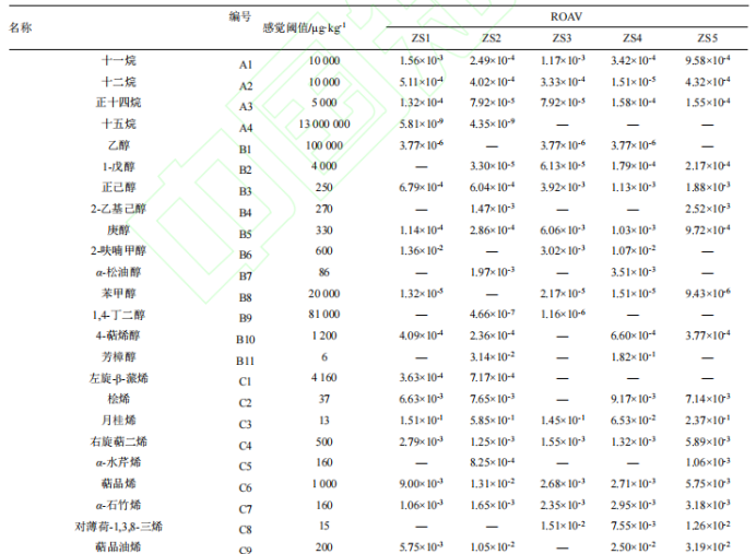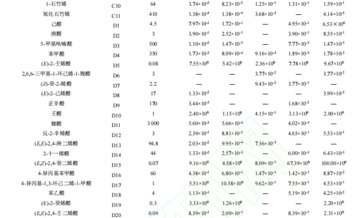 根據文獻查閱感覺閾值并計算抓飯香氣成分ROAV,本研究只針對能查到感覺閾值的化合物。篩選ROAV大于0.1的揮發性物質分析,結果如表4所示,(E,Z)-2,4-癸二烯醛對抓飯香氣貢獻最大,定義其為ROAVmax=100,ROAV≥1的物質對抓飯香氣貢獻較大,0.1≤ROAV<1的物質對抓飯香氣有重要的修飾作用。月桂烯、1-石竹烯、己醛、庚醛、(E)-2-壬烯醛、反-2-辛烯醛、壬醛、(E,Z)-2,4-癸二烯醛、4-異丙基苯甲醛、4-異丙基-1,3-環己二烯-1-甲醛、苯乙醛、(E)-2-癸烯醛、(E,E)-2,4-壬二烯醛、(E,E)-2,4-癸二烯醛、(E)-2-庚烯醛、α-紫羅酮、β-紫羅酮、2-正戊基呋喃18種化合物ROAV大于0.1,為抓飯香氣主要香氣成分。其中(E,Z)-2,4-癸二烯醛、(E,E)-2,4-癸二烯醛、4-異丙基-1,3-環己二烯-1-甲醛、(E)-2-癸烯醛、壬醛、(E)-2-壬烯醛、β-紫羅酮7種化合物ROAV大于1,為抓飯關鍵香氣成分,其余11種化合物對抓飯香氣具有重要修飾作用。