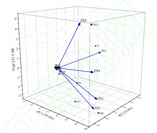 為進一步研究抓飯揮發性成分的變化,采用主成分分析法對抓飯ROAV進行分析。由圖5可知,第一主成分方差貢獻率為59.4%,第二主成分方差貢獻率為19.4%,第三主成分方差貢獻率為15.8%,前3個主成分方差累計率為94.6%,表明3個主成分能夠代表原始數據的信息。在第一主成分上,D5[(E)-2-壬烯醛]、D10(壬醛)、D15[(E,Z)-2,4-癸二烯醛]、D19[(E)-2-癸烯醛]、D21[(E,E)-2,4-癸二烯醛]、E6(β-紫羅酮)為正影響,其余為負影響;在第二主成分上,D5[(E)-2-壬烯醛]、D10(壬醛)、D17(4-異丙基-1,3-環己二烯-1-甲醛)、E6(β-紫羅酮),D15[(E,Z)-2,4-癸二烯醛]較高負影響;在第三主成分上,D1(己醛)、D15[(E,Z)-2,4-癸二烯醛]、E6(β-紫羅酮)較高整影響,C3(月桂烯)、D2(庚醛)、D5[(E)-2-壬烯醛]、D10(壬醛)、D16(4-異丙基苯甲醛)、D17(4-異丙基-1,3-環己二烯-1-甲醛)、D19[(E)-2-癸烯醛]、D21[(E,E)-2,4-癸二烯醛]為負影響。表明這些揮發性物質可能是影響不同市售抓飯風味差異的關鍵物質。
