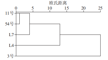 式中:Cri、Ti分別為各揮發(fā)性化合物的相對含量/%和氣味閾值/(μg/kg);Crstan、Tstan分別為對樣品風(fēng)味貢獻(xiàn)最大組分的相對含量/%和氣味閾值/(μg/kg)。 ROAV≥1的物質(zhì)為該品種金針菇的特征揮發(fā)性物質(zhì);0.1≤ROAV<1的物質(zhì)對該品種金針菇整體風(fēng)味有修飾作用,且ROAV越大說明該物質(zhì)對該品種樣品總體風(fēng)味貢獻(xiàn)越大。 不同品種金針菇揮發(fā)性物質(zhì)的SPME-GC-MS分析 如表1所示,5個品種金針菇樣品中共檢測出53種揮發(fā)性成分,3號、11號、54號、L4和L7分別檢測出21、29、21、12種和18種成分,其中醇類、醛類和芳香烴類占總含量的60%~95%。不同品種金針菇僅有2種共有揮發(fā)性成分,分別為1-己醇和2-十一烷酮。每種金針菇都有3種或3種以上其他品種中不存在的化合物,3號、11號、54號、L4和L7中特有化合物數(shù)量分別為3、12、3、4種和4種。 表1 不同品種金針菇樣品中揮發(fā)性化合物的相對含量 如表2所示,辛醛、苯乙醛、壬醛、癸醛、2-十一烷酮、2-甲基丁酸甲酯、D-檸檬烯為3號金針菇的特征揮發(fā)性物質(zhì)(ROAV≥1),香葉基丙酮對3號金針菇的整體風(fēng)味起修飾作用(0.1≤ROAV<1);1-己醇、反式-2-庚烯醛、辛醛、反式-2-辛烯醛、壬醛、2-十一烷酮、香葉基丙酮、2-正戊基呋喃、D-檸檬烯為11號金針菇的特征揮發(fā)性物質(zhì)(ROAV≥1),1-庚醇、1-辛醇對11號金針菇的整體風(fēng)味起修飾作用(0.1≤ROAV<1);1-壬醇、辛醛、壬醛、癸醛、2-十一烷酮、D-檸檬烯為54號金針菇的特征揮發(fā)性物質(zhì)(ROAV≥1),1-辛醇、反式-2-庚烯醛對54號金針菇的整體風(fēng)味起修飾作用(0.1≤ROAV<1);1-壬醇、庚醛、辛醛、反式-2-辛烯醛、癸醛、2-十一烷酮、2-正戊基呋喃為L4金針菇的特征揮發(fā)性物質(zhì)(ROAV≥1),1-己醇對L4金針菇的整體風(fēng)味起修飾作用(0.1≤ROAV<1);反式-2-辛烯醛、反,反-2,4-癸二烯醛、癸醛、2-十一烷酮為L7金針菇的特征揮發(fā)性物質(zhì)(ROAV≥1),1-己醇、1-辛醇、反式-2-庚烯醛對L7金針菇的整體風(fēng)味起修飾作用(0.1≤ROAV<1)。 5種金針菇中共檢測出5種醇類化合物,存在于4個品種金針菇中的1種,是1-辛醇,1-庚醇和1-戊醇均只在11號金針菇中被檢測到。 5種金針菇中共檢測出10種醛類化合物,在4種金針菇中被檢測到的有3種,分別為己醛、辛醛和癸醛,庚醛、苯乙醛和反,反-2,4-癸二烯醛分別是L4、3號和L7金針菇中特有化合物。酸類化合物只在54號金針菇中被檢測到,5種金針菇中共檢測出7種酯類化合物。其中只有鄰苯二甲酸二異丁酯存在于2種金針菇中,其他6種化合物均屬于特有化合物。5種金針菇中共檢測出3種酮類化合物,共有的1種,為2-十一烷酮。 5種金針菇中共檢測出6種烷烴類化合物,特有化合物2種,分別為壬烷和2,6,10,14-四甲基十六烷。 5種金針菇中共檢測出5種其他類化合物,獨有化合物有2種,分別為2-甲基-2-(1-甲基乙基)環(huán)氧乙烷和4,5,6,7-四氫-3,6-二甲基-苯并呋喃。 表2 不同品種金針菇樣品中揮發(fā)性成分及對應(yīng)的ROAV 為了顯示5個品種金針菇樣品組中53種揮發(fā)性成分的差異,使用PCA對SPME-GC-MS進(jìn)行分析。如圖1所示,前2個主要成分的貢獻(xiàn)率是85.15%;PC1占52.31%,PC2占32.84%。PC1和PC2都明確區(qū)分了不同品種,5個樣本組相互之間很好地分開,說明不同品種金針菇間揮發(fā)性風(fēng)味相互獨立,且這2個主成分可代表樣品風(fēng)味的主要特征。所有的揮發(fā)組分根據(jù)不同品種樣品組也同樣明顯地區(qū)分開,其中,54號金針菇樣品組與12種化合物分布重疊,11號金針菇樣品組與4種化合物分布重疊。而其他3個品種樣品組雖然沒有與化合物重疊,但四周都有各自相關(guān)的化合物。然而還是有很多比較分散的化合物,處于不同品種之間。這表明盡管使用53種揮發(fā)性化合物也可以將品種區(qū)分開,但是金針菇的揮發(fā)性風(fēng)味物質(zhì)較復(fù)雜,并且在不同品種中有許多相似的物質(zhì),因此僅用SPME-GC-MS判別不同品種金針菇風(fēng)味較為局限。 圖1 不同品種金針菇樣品基于SPME-GC-MS的PCA 為了進(jìn)一步分析SPME-GC-MS對于不同品種金針菇揮發(fā)性風(fēng)味成分區(qū)分情況,將SPME-GC-MS數(shù)據(jù)進(jìn)行HCA,結(jié)果如圖2所示。從圖2可以看出,不同品種金針菇揮發(fā)性成分的聚類樹狀圖顯示出3個主要類別。其中,11號、54號和L7的樣品被歸為一類,而L4和3號的樣本被分別歸為其余兩類。在第一大類中,11號和54號的樣品在最小距離水平上首先聚類,這說明二者的樣品揮發(fā)性成分相似度很高。隨著歐式距離的增加,L7的樣品也并入到這一類中。而當(dāng)歐式距離增加至13時,L4與11號,54號和L7的樣品歸為一類。隨著歐式距離的繼續(xù)增大,當(dāng)增至25時,三大類才歸為一類。這與2.1.2節(jié)結(jié)果一致。HCA差異主要由不同品種中各類化合物種類和含量不同造成。結(jié)合表1可知,由于醇類、醛類和芳香烴類物質(zhì)占所檢測總物質(zhì)的60%~95%,因此影響樣品聚類的主要因素是三者的相對含量。 不同品種金針菇揮發(fā)性物質(zhì)的電子鼻分析 將電子鼻數(shù)據(jù)作雷達(dá)圖,如圖3所示,顯示12個傳感器對5個不同品種金針菇樣本組的響應(yīng)。傳感器PA/2、T70/2、P40/1、P10/2、P10/1和T30/1對L7金針菇的揮發(fā)性氣味響應(yīng)值最高;傳感器LY2/G、LY2/AA、LY2/GH、LY2/gCTL和LY2/gCT對3號金針菇的