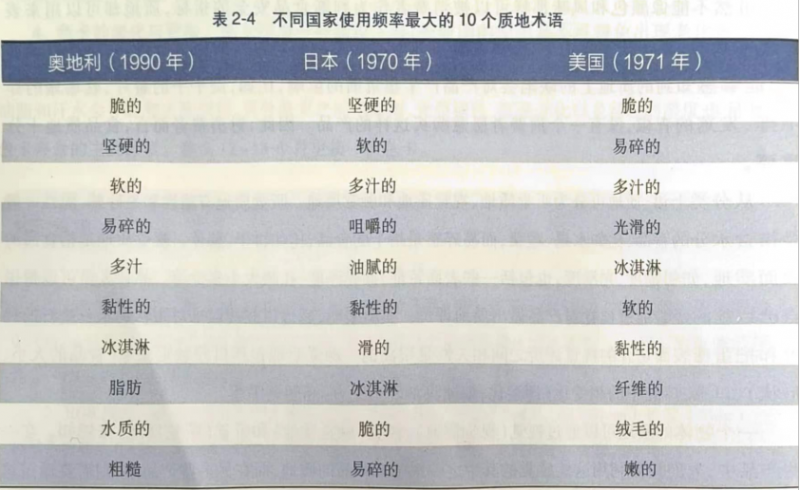一定的質地術語和感覺可以跨越文化的差異,具有國際性。因此,任何國家、文化或地區的感官專家應當不僅僅注意食品可感知到的風味、味道和顏色的量值,而且要注意能感知到的質地特征。有研究表明:不同國家的質地描述詞匯大多數是相同的,如表2-4所示。