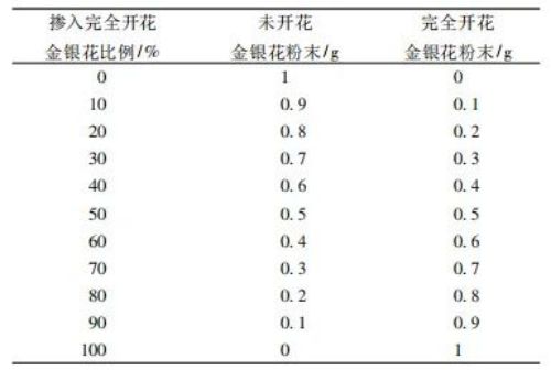 金銀花(未開花干花、完全開花干花);HeraclesⅡ超快速氣相電子鼻。 未開花與完全開花金銀花打粉,過4號篩,取過篩后的未開花與完全開花金銀花粉末調(diào)配為總量為1g待測樣品,充分震蕩混勻,具體調(diào)配比例見表1,并以此分組。