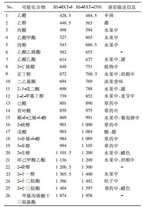 HeraclesⅡ超快速氣相色譜電子鼻具有兩根極性存在差異的色譜柱,即MXT-5(低極性)和MXT-1701(中極性),扣去空白參考后,各比例金銀花粉末色譜圖見圖1,2。不同比例金銀花粉末色譜圖中的色譜峰位置基本未發(fā)生變化,說明其基于氣味的定性較為類似,將保留時間轉(zhuǎn)換為Kovats保留指數(shù)后,經(jīng)AroChembase數(shù)據(jù)庫得出定性結(jié)果,見表3。