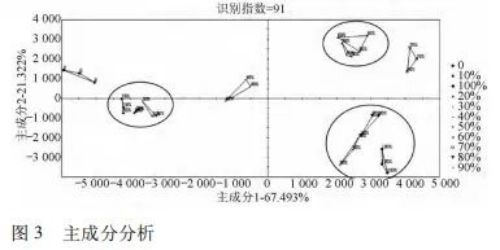 PCA是將所得的數(shù)據(jù)進(jìn)行降維,提取幾個特征值較大能反映樣本信息變量的因子進(jìn)行線性分類,以得到具有不同氣味區(qū)域和簇的描述性圖表。在經(jīng)過超快速氣相電子鼻檢測得到不同調(diào)配比例金銀花粉末的色譜峰面積以及峰數(shù)量后,篩選出區(qū)分能力強(qiáng)(>0.900)且峰面積較大(range>1000)分離效果較好的色譜峰作為傳感器,進(jìn)行PCA分析,得出主成分1與主成分2累計貢獻(xiàn)率88.815%,能夠較好地反映所測樣品中氣味信息。識別指數(shù)91,說明超快速氣相電子鼻可有效區(qū)分不同調(diào)配比例金銀花粉末,見圖3。此外,10%~20%,20%~30%,50%~60%,80%~90%,90%~100%間區(qū)分較為困難。據(jù)此,可將不同調(diào)配比例金銀花粉末可分為6類,即①0;②10%,20%,30%;③40%;④50%,60%;⑤70%;⑥80%,90%,100%。