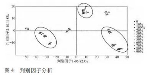 DFA是在主成分分析的基礎(chǔ)上,縮短組內(nèi)樣品間距離,增大組間差距。因此,本研究以主成分分析中所采用的傳感器,進(jìn)行判別因子分析,結(jié)果見圖4。由此可知,各調(diào)配比例的金銀花粉末可通過超快速氣相電子鼻進(jìn)行快速鑒別,而且區(qū)分效果較好,所得趨勢及結(jié)果與主成分分析基本相同,使PCA結(jié)果得到進(jìn)一步驗證。