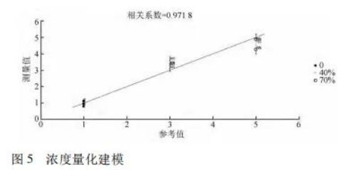 濃度量化建模采用的方法為偏最小二乘法(PLS),可使色譜圖數(shù)據(jù)與濃度值間建立線性關(guān)系,起到對未知樣品濃度進(jìn)行預(yù)測的作用。本實驗中采用預(yù)先調(diào)配的金銀花粉末,將摻入完全開花粉末比例設(shè)為濃度,即濃度量化建模中的因變量,以所測得氣相色譜圖數(shù)據(jù)作為自變量,進(jìn)行濃度量化建模。為實現(xiàn)較好的鑒別結(jié)果,將PCA及DFA組間區(qū)分較為良好的0,40%,70%完全開花金銀花粉末摻入比例作為節(jié)點,并將0,40%,70%濃度分別設(shè)為1,3,5,進(jìn)行濃度量化建模,所得結(jié)果見圖5,相關(guān)系數(shù)為0.9718。建模后,將10%,20%,30%,50%,60%,80%,90%,100%的原始色譜數(shù)據(jù)進(jìn)行投影驗證,可得到較好的濃度預(yù)測結(jié)果,模型良好。另外,根據(jù)此模型,可實現(xiàn)基于摻入完全開花金銀花粉末比例的質(zhì)量分級,即濃度預(yù)測結(jié)果小于3,為金銀花粉末中摻入完全開花粉末量低于40%,列為一等;濃度預(yù)測結(jié)果不低于3且小于5,為金銀花粉末中摻入完全開花粉末量在40%~70%,列為二等;濃度預(yù)測結(jié)果不低于5,為金銀花粉末中摻入完全開花粉末量不低于70%,列為三等。