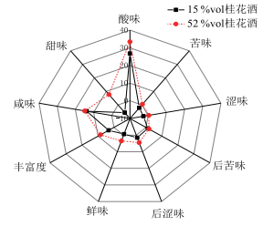 15%vol市售桂花酒與自制52%vol桂花酒經(jīng)過電子舌滋味分析系統(tǒng)檢測后,結果如圖2和表3所示。由表5可知,自制桂花酒在酸味、咸味方面非常突出,有飽滿的豐富度,可明顯感知鮮味和后澀味,在苦味、澀味及后苦味方面感覺較弱;市售桂花酒除了在酸味、咸味方面非常突出,豐富度不如自制桂花酒飽滿,后苦及后澀味感覺較弱,且基本察覺不出苦味、澀味及鮮味,與不同桂花酒的感官評價較一致。