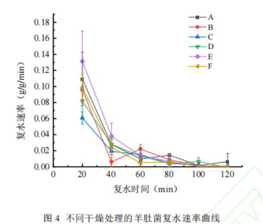 不同干燥處理的羊肚菌干品復水速率如圖4所示。復水20min時的羊肚菌的復水速率E處理>A處理>F處理>B處理>D處理>C處理,E處理羊肚菌在20min時復水速率最高,各處理隨著復水時間的延長,復水速率逐漸降低,F處理羊肚菌在60min時復水率最先趨近于0,子實體的復水速度最快,80min后各處理組羊肚菌復水率均趨于0,子實體的重量不再明顯增加。